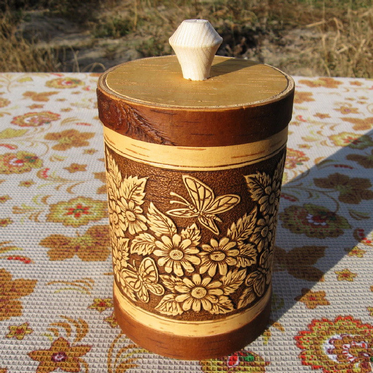 Берестяной туясок с рисунком «Ромашки». Цвет: светлый/темный