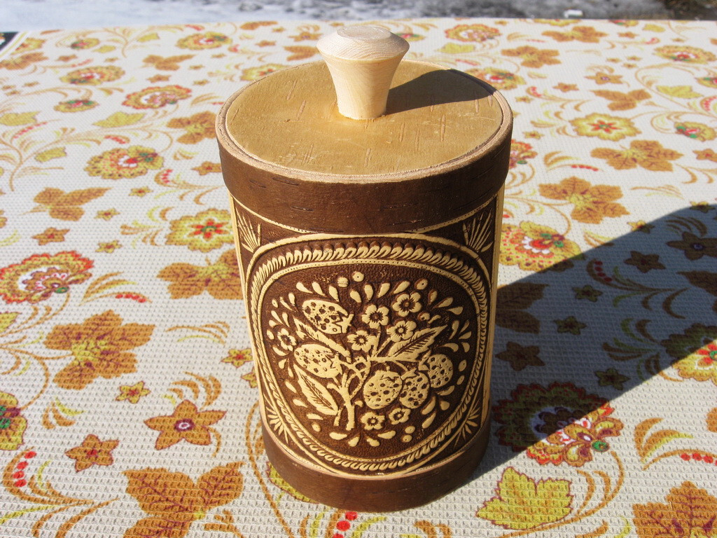 Красивый берестяной туясок с рисунком в русско-народном стиле. Высота 16см, ширина 10,5см.