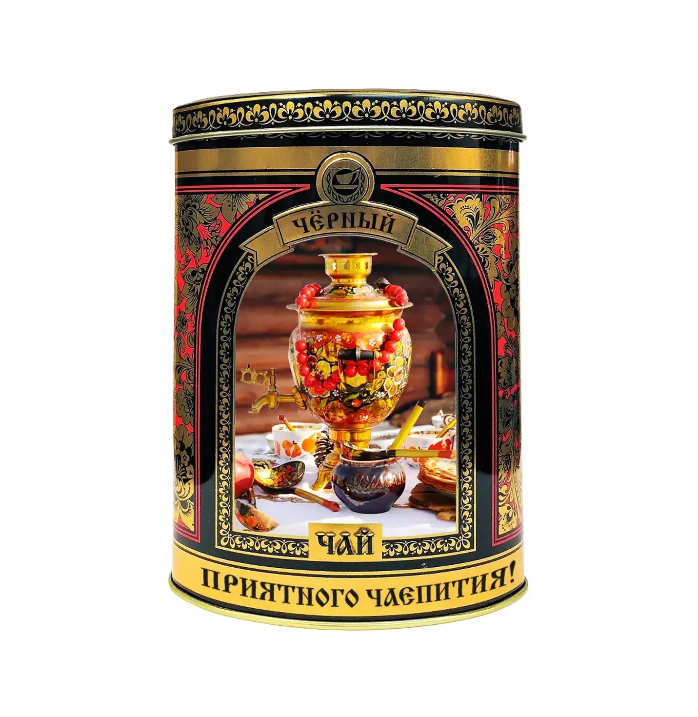Чай черный индийский в подарочной жестяной банке в русском народном стиле.