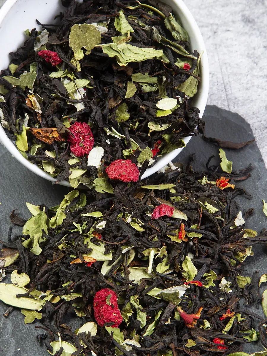 Чай черный индийский крупнолистовой, лепестки граната, листья мяты и брусники, ягоды малины, натуральный ароматизатор малины.