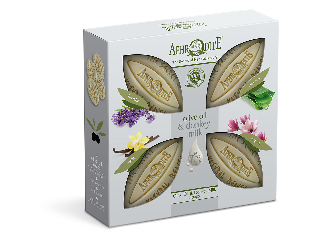 Набор мыла оливкового «Эликсир молодости» 4 шт: с молоком ослиц и магнолией, с молоком ослиц и алоэ, с молоком ослиц и лавандой, с молоком ослиц и ароматом ванили. «APHRODITE»