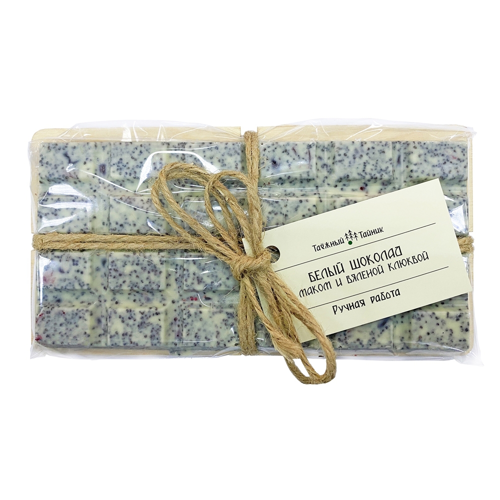 шоколад белый (сахар, какао-масло, цельное сухое молоко, лецитин, ванилин), мак, вяленая клюква