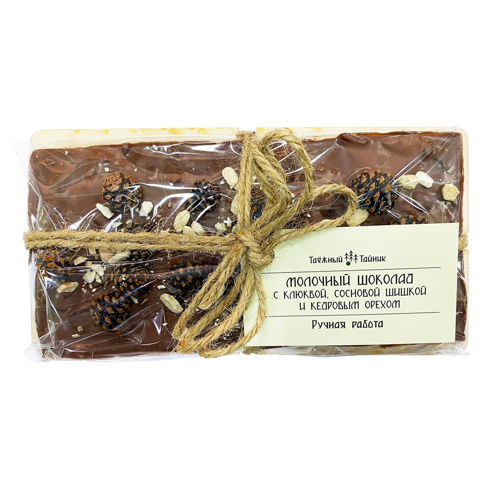 шоколад молочный 34%(сахар, какао-масло, цельное сухое молоко, какао-тертое, лецитин, ванилин), вяленая клюква, сосновая шишка, жмых кедрового ореха.