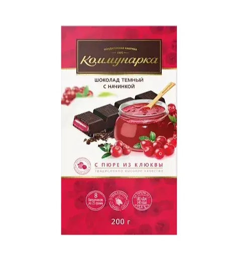 Шоколад темный ( сахар, какао тертое, масло какао, эмульгаторы(лецитин рапсовый, Е476), ароматизатор натуральный «Ваниль», начинка фруктовая(пюре яблочное, сахар, патока, жир кондитерский(смесь растительных масел, антиокислители:аскорбиновая кислота, Е307), агент влагоудерживающий сорбитовый сироп, регуляторы кислотности( кислота лимонная, цитрат натрия), агент желирующий пектин, пюре клюквенное(содержит консервант деоксид серы), како тертое, ароматизатор «Клюква», комплексная пищевая добавка «Краситель натуральный Кармин»( вода питьевая, агенты влагоудерживающие (Е422, Е1520) , краситель Е120, регулятор кислотности Е525), масло какао, эмульгаторы лецитин соевый.